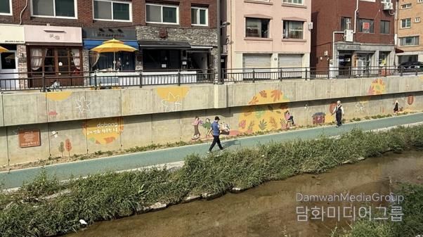 시민행정신문 강갑수 기자 | 방학천(금강아미움 맞은편~방학교) 옹벽 약 360m 구간이 걷고 싶고 머무르고 싶은 산책길로 탈바꿈했다.