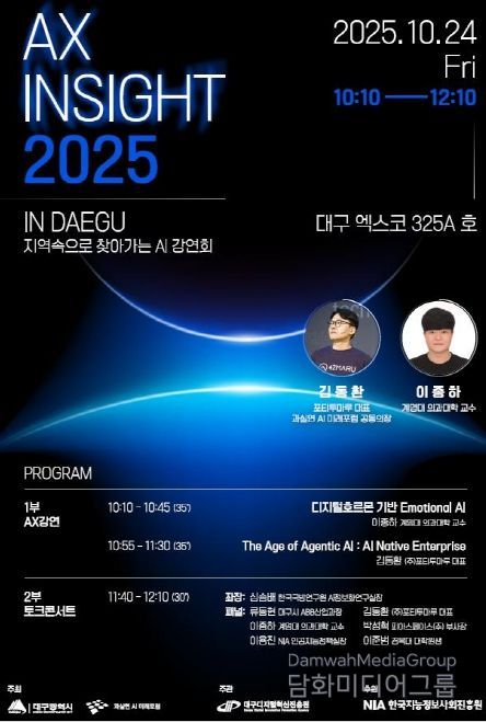 시민행정신문 강갑수 기자 | 대구광역시는 (사)과실연 AI미래포럼과 함께 10월 24일(금) 대구 엑스코에서 ‘AX·Security Insight 2025 In Daegu’를 개최한다.