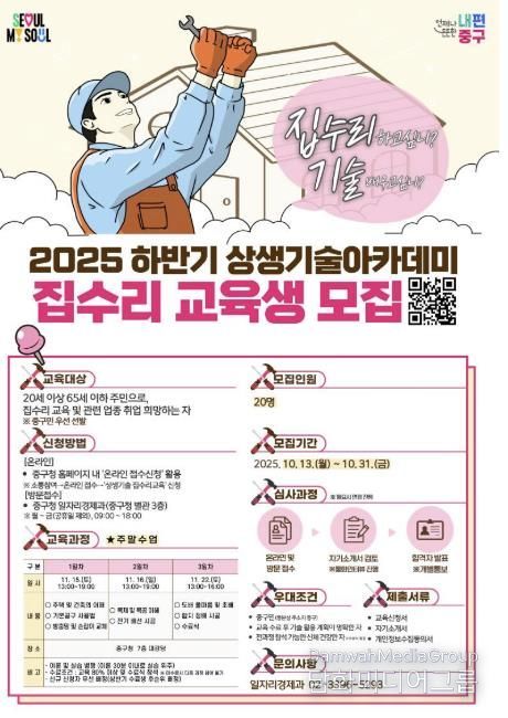 신청 기간은 10월 31일까지이며, 온라인 또는 방문 접수로 신청할 수 있다. 온라인 신청은 중구청 홈페이지 ‘소통참여 → 온라인 접수신청 → 상생기술 집수리 교육’ 메뉴에서 가능하다. 방문 신청은 중구청 별관 3층 일자리경제과에서 할 수 있다.
