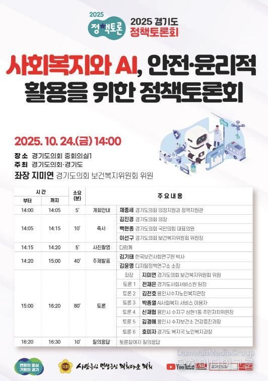 행사는 경기도의회, 경기도가 공동 주최하며, 지미연 의원이 좌장을 맡아 진행한다. 이날 행사에는 학계, 공공기관, 보건의료 분야, 주민 대표, 경기도 담당부서 등 다양한 분야의 전문가들이 참석해 사회복지 영역에서의 AI 기술 안전 활용 방안과 제도적 개선 방향을 논의할 예정이다.