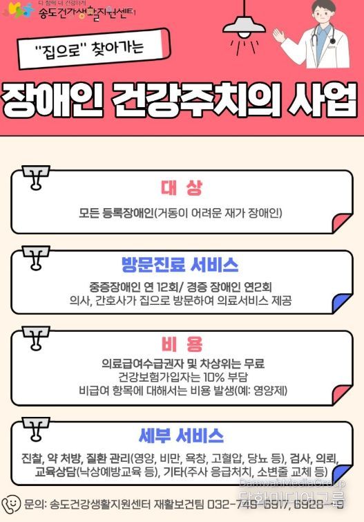 한편, 구는 올해 장애인 34명을 건강주치의와 연계해 보다 편리하게 진료받을 수 있도록 지원했으며, 서비스 이용을 원하는 구민은 송도건강생활지원센터 재활보건팀으로 문의하면 된다.