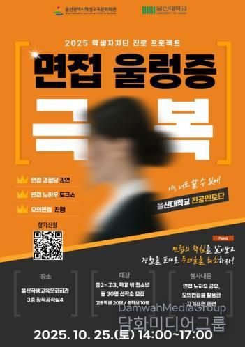 시민행정신문 기자 | 울산학생교육문화회관은 오는 25일 본관 학생자치실에서 중2~고3, 학교 밖 청소년 등 30명을 대상으로 ‘면접 울렁증 극복 프로그램’을 진행한다.