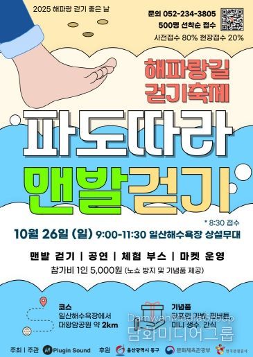 시민행정신문 기자 | 울산 동구가 오는 10월 26일 오전 9시부터 11시 30분까지 일산해수욕장 상설무대 일원에서 ‘2025 해파랑길 걷기 축제 – 파도 따라 맨발 걷기’를 개최한다.
