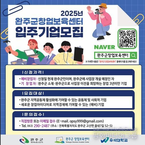 모집 대상은 ▲완주군 지역공동체 활성화에 기여할 수 있는 공동체 및 사회적 기업 ▲새로운 창업 아이디어로 지역경제 활성화에 기여할 수 있는 (예비)기업 등이다.