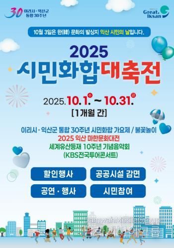 익산시는 이리시·익산군 통합 30주년을 기념해 10월 한 달간 시민들이 일상에서 문화와 여가를 즐길 수 있는 '시민화합대축전'을 이어가고 있다.