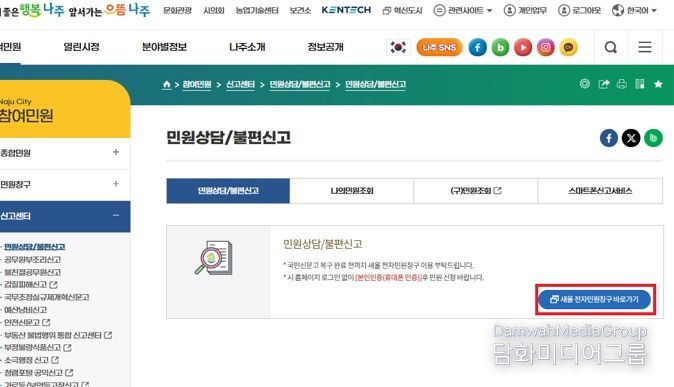 나주시(시장 윤병태)는 지난 9월 26일 발생한 국가정보자원관리원 화재 이후 국민신문고와 안전신문고 기능이 일시 중단됨에 따라 시청 누리집에 ‘새올 전자민원창구’ 임시 페이지를 개설해 일반 민원을 접수하고 있다고 16일 밝혔다.