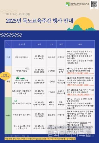 시민행정신문 기자 | 경상북도교육청 청도도서관은 오는 10월 17일부터 30일까지 지역 주민을 대상으로 '2025년 독도교육주간 행사'를 운영한다.