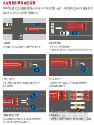 소방서는 도로 주행 중 긴급차량의 사이렌이 들릴 경우, 운전자가 즉시 도로 가장자리로 이동하거나 일시 정지해야 한다며 교차로, 일방통행로, 편도 도로 등 상황별 올바른 대처 요령을 안내했다.