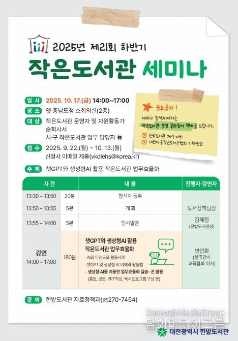 시민행정신문 강갑수 기자 | 한밭도서관은 17일 금요일 오후 14시부터 구 충남도청사 소회의실(2층)에서 대전 지역 작은도서관 운영자와 자원활동가를 대상으로 세미나를 개최한다.