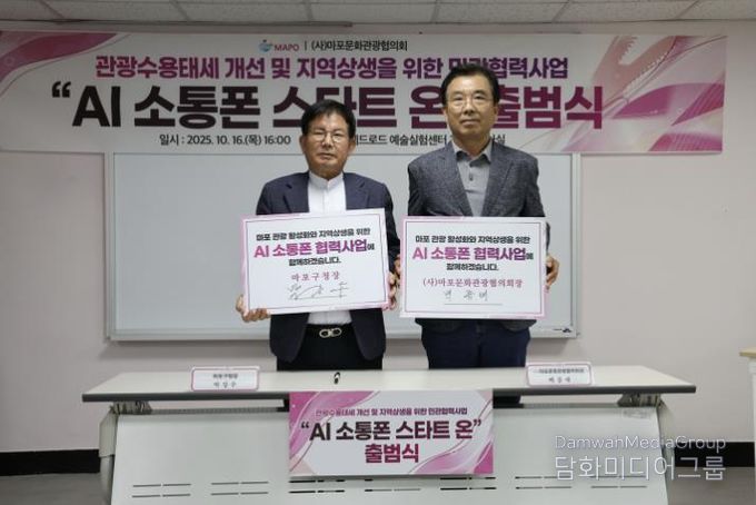 마포구는 10월 16일 오후 4시, 레드로드예술실험센터 2층 세미나실에서 ‘AI 소통폰 스타트 온(Start ON)’ 협력사업 출범식을 열고 외국인 관광객과 상인의 소통 강화를 위한 민관 협력의 첫발을 내디뎠다.