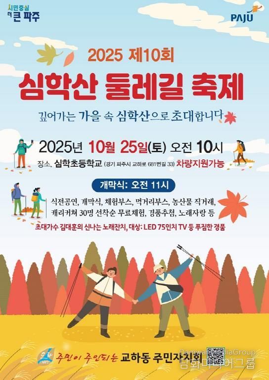 시민행정신문 기자 | 파주시 교하동 주민자치회는 오는 25일 10시, 심학초등학교에서 ‘2025년 제10회 심학산 둘레길 축제’를 개최한다고 밝혔다.