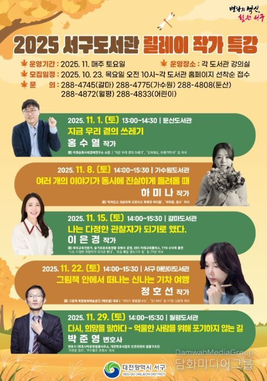 시민행정신문 강갑수 기자 | 대전 서구 관내 5개 공공도서관은 11월 한 달간 ‘서구도서관 릴레이 작가 특강’을 운영한다고 17일 전했다.