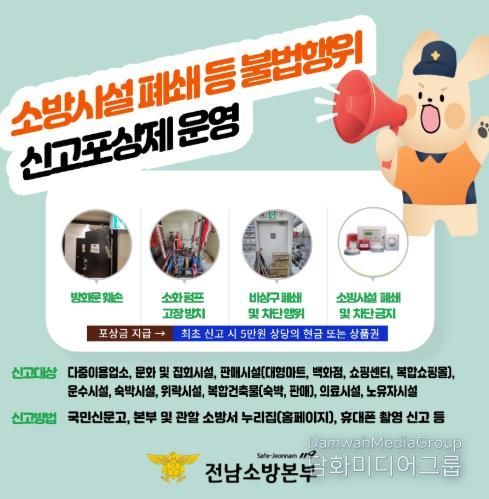 신고포상제는 다중이용시설이나 숙박시설 등에서 발생할 수 있는 소방 관련 불법행위를 군민이 직접 신고해 개선을 유도하는 제도로, 지역 안전문화 정착을 위한 군민 참여형 제도다.