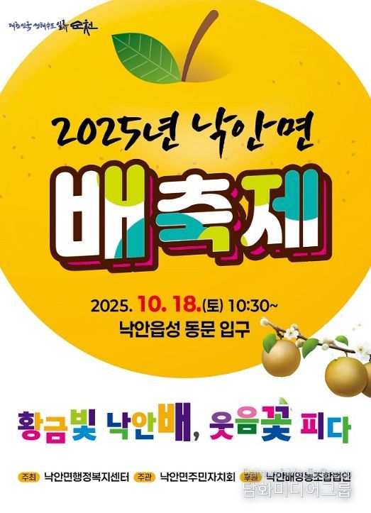 이번 축제는 낙안면 주민자치회가 주관해 지역 특산물인 ‘배’를 주제로 직접 기획하고 준비한 주민 주도형 축제로 주민참여예산 사업으로 추진돼 더욱 뜻깊은 행사가 될 전망이다.