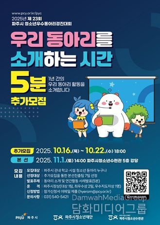 시민행정신문 기자 | (재)파주시청소년재단 파주시청소년수련관은 오는 10월 16일부터 10월 22일까지 “제23회 파주시 청소년우수동아리경진대회”의 참가 동아리를 모집한다.