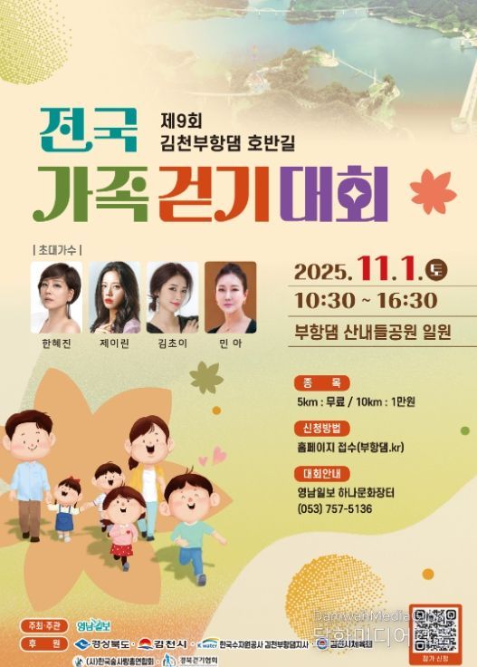 손중일 건강증진과장은 “이번 대회는 걷고, 쉬고, 즐기고, 추억까지 남길 수 있는 가족 나들이형 축제”라며, “부항댐의 가을 절경 속에서 가족과 함께 특별한 하루를 보내시길 바란다.”라고 전했다.