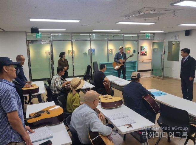 시민행정신문 강갑수 기자 | 고성군이 운영하는 고성군종합사회복지관 분관에서는 10월 17일 저녁, 야간노래교실과 통기타반 수강생들을 격려하기 위해 이상근 군수가 직접 현장을 방문했다.