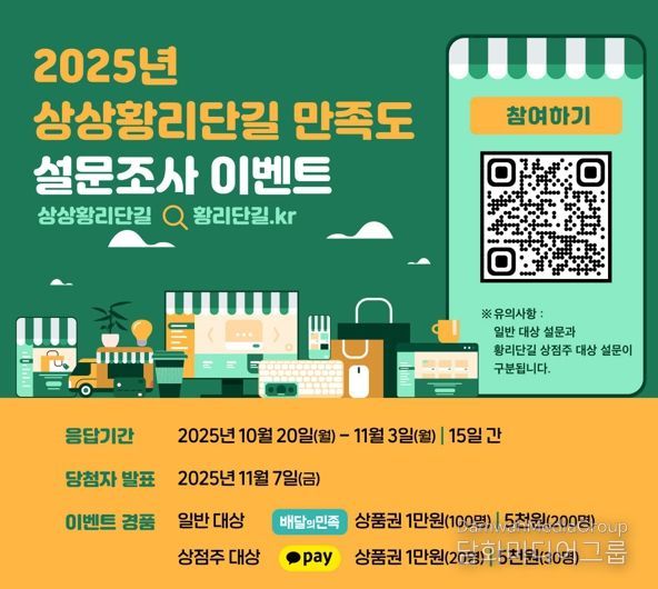 참여 방법은 홈페이지 이벤트 참여 메뉴 또는 홍보용 QR코드 접속을 통해 가능하며, 설문을 완료한 일반인 300명과 상점주 50명을 추첨해 소정의 경품을 제공한다.