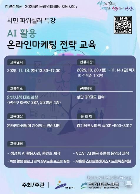 교육은 11월 18일 오후 1시 30분부터 5시 30분까지 안산시청 대회의실(제2별관 4층)에서 진행된다. 온라인 마케팅에 관심 있는 시민 누구나 무료로 참여할 수 있다.