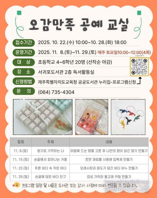오감만족 공예 교실 프로그램은 안경숙 오아오아 공방 대표와 함께 초등학생 4학년~6학년 20명을 대상으로 다음 달 8일부터 29일까지 매주 토요일 오전 10시~12시에 서귀포도서관 독서활동실에서 4회 운영할 예정이다.