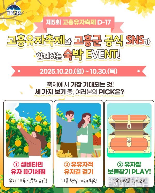 시민행정신문 강갑수 기자 | 고흥군은 10월 20일부터 30일까지 11일간, 고흥군 공식 SNS 채널을 통해 ‘제5회 고흥유자축제 D-17! 숙박이벤트’를 진행한다고 밝혔다.