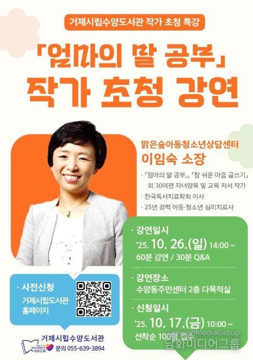 시민행정신문 강갑수 기자 | 거제시립수양도서관은 오는 26일 오후 2시 『엄마의 말 공부』로 잘 알려진 이임숙 작가를 초청해“부모와 아이를 이어주는 공감과 존중의 대화법”을 주제로 한 강연을 연다.