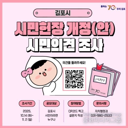 시 관계자는 “이번 개정은 단순한 문구 수정이 아니라, 김포의 현재와 미래를 함께 담아낼 새로운 시민의 약속을 만드는 과정”이라며, “시민 한 분 한 분의 목소리가 개정안에 반영될 수 있도록 적극적인 참여를 부탁드린다”고 말했다.