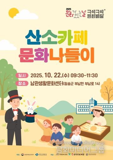 시민행정신문 기자 | (재)청송문화관광재단은 오는 10월 22일과 11월 25일 청송군 부남면 남관생활문화센터에서 2025 문화가 있는 날 '구석구석 문화배달' 사업의 일환으로 ‘산소카페 문화나들이’ 행사를 개최한다.