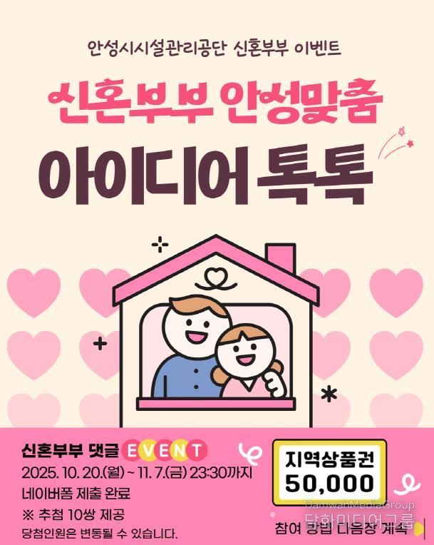 댓글 주제는 △공단에 있었으면 하는 시설·프로그램 제안 △신혼부부로서 공단 시설 이용 시 개선이 필요하다고 느낀 점 등이다. 참여자 중 10쌍을 추첨해 안성지역화폐 5만원권을 지급하며 당첨자는 11월 13일 공단 홈페이지 및 공식 SNS를 통해 발표된다.