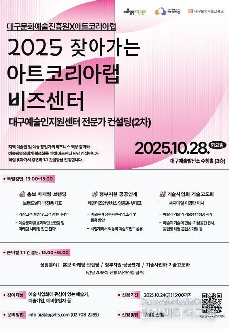 오는 10월 25일 대구예술발전소 수창홀에서 열리는 2차 컨설팅은 문화체육관광부 산하 예술경영지원센터의 ‘찾아가는 아트코리아랩 비즈센터’와 협력해 진행된다.