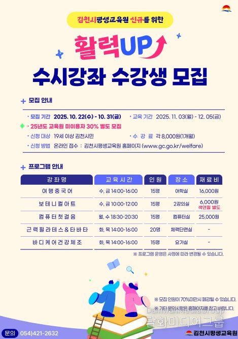 시민행정신문 강갑수 기자 | 김천시평생교육원은 시민들의 일상에 배움의 활력을 불어넣을‘활력 UP 수시 강좌’를 개설하여, 오는 10월 22일부터 10월 31일까지 수강생 모집에 나선다.