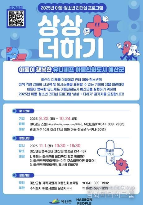 시민행정신문 강갑수 기자 | 예산군은 아동·청소년이 주체가 돼 아동친화도시 조성에 참여하는 ‘상상+더하기 아동·청소년 리더십 프로그램’의 참가자 모집기간을 기존 10월 17일에서 24일까지로 연장했다고 밝혔다.