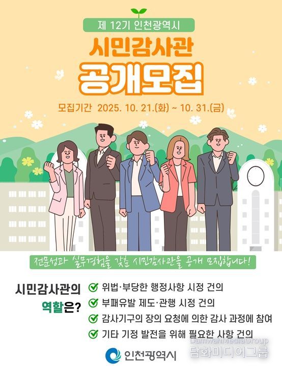 시민행정신문 강갑수 기자 | 인천광역시는 제12기 시민감사관을 10월 21일부터 10월 31일까지 공개모집한다고 밝혔다.
