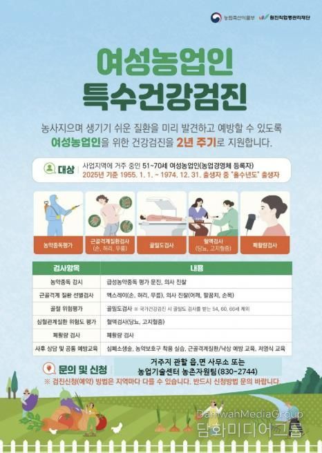 송인헌 군수는 “이번 특수건강검진을 통해 여성농업인들이 농작업 질환을 조기에 예방하고, 건강한 농촌생활을 이어갈 수 있기를 바란다”며 “신속하고 체계적인 검진이 이뤄질 수 있도록 행정적 지원에 최선을 다하겠다”고 밝혔다.