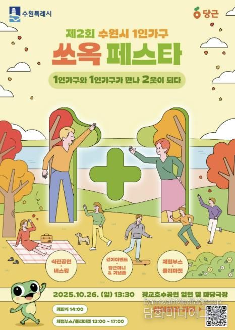 오는 26일 오후 수원 광교호수공원에 가면 시민 누구나 호숫가에서 걷기 운동을 하며 이웃을 만들 수 있다. ‘제2회 수원시 1인가구 쏘옥 페스타 1+1’이 1인가구와 시민들을 연결하는 폭넓은 소통의 장을 마련한다. 1인가구에 도움이 되는 다양한 정보를 얻고, 1인가구라서 느끼는 고민을 서로 나누고, 취미가 맞는 1인가구끼리 새 친구가 되는 기회다. 운이 좋으면 1만원의 당근머니도 받게 되는 가을 소풍을 즐겨보자.