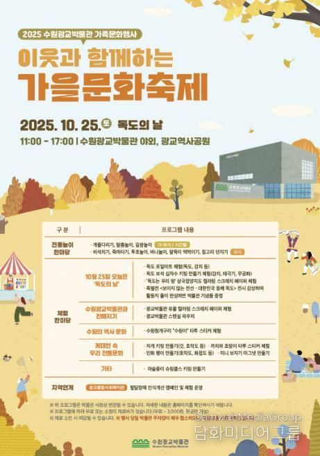 시민행정신문 기자 | 수원광교박물관은 독도의 날인 10월 25일 오전 11시부터 오후 5시까지 수원광교박물관 야외(광교역사공원)에서 ‘2025 수원광교박물관 가족문화행사–이웃과 함께하는 가을문화축제’를 연다.