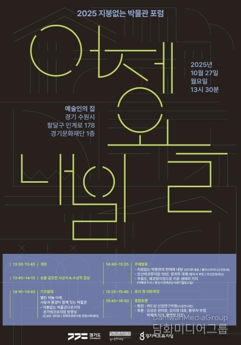 시민행정신문 기자 | 경기도와 경기문화재단은 일상 곳곳의 발자취를 ‘박물관’으로 만드는 지붕없는 박물관(경기에코뮤지엄)사업의 '2025 지붕없는 박물관 포럼_어제·오늘·내일'을 10월 27일 오후 1시 30분 경기문화재단 예술인의 집(수원)에서 개최한다.
