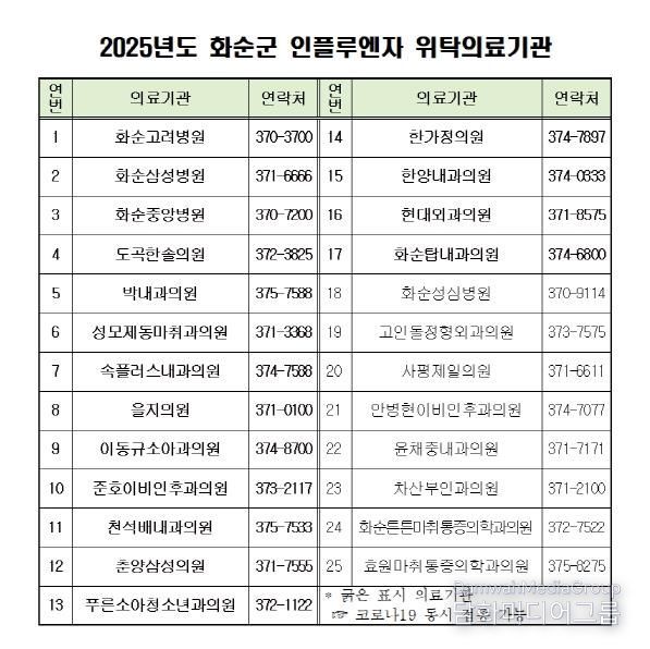 시민행정신문 강갑수 기자 | 화순군은 65세 이상 어르신을 대상으로 2025~2026 절기 인플루엔자(독감) · 코로나19 무료 예방접종을 실시한다고 21일 밝혔다.