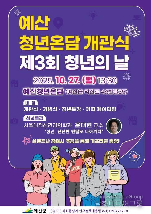 시민행정신문 기자 | 예산군은 오는 10월 27일 오후 1시 30분, 예산읍 주교리에 위치한 청년거점공간 ‘예산청년온담’에서 개관식과 제3회 청년의 날 기념행사를 개최한다고 밝혔다.