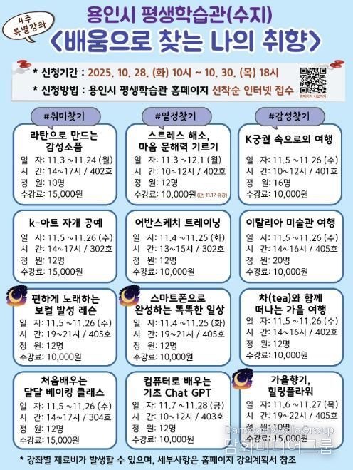 용인시 관계자는 “시민들이 배움의 즐거움을 느낄 수 있도록 실용적이고 유익한 교육 프로그램을 꾸준히 확대해 나가겠다”고 말했다.