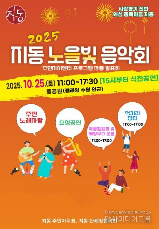 시민행정신문 기자 | 오는 10월 25일, 수원시 팔달구 지동 동공원(지동 267-12)에서 활력 넘치는 가을날을 아름다운 음악과 주민들의 열정으로 채울 특별한 축제, ‘2025 지동 노을빛 음악회·주민자치센터 작품발표회’가 열린다.