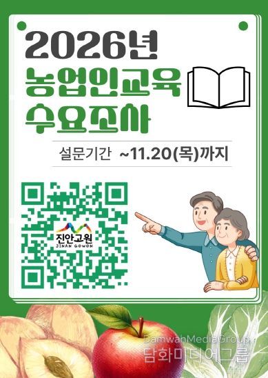 시민행정신문 강갑수 기자 | 진안군(군수 전춘성)은 2026년도 진안환경농업대학 및 농업인교육 과정 선정을 위해 10월 21일부터 11월 20일까지 한 달간 진안군민과 농업인의 다양한 의견을 반영하기 위한 ‘농업인 교육 수요조사’를 실시한다.