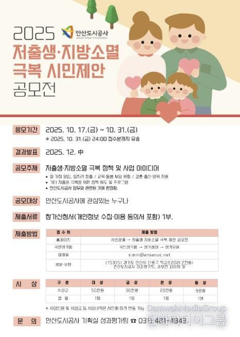 시민행정신문 강갑수 기자 | 안산도시공사는 ‘2025년 저출생지방소멸 극복 시민제안 공모전’을 열고 시민과 함께 인구문제 극복방안을 모색하고 시민 체감형 정책·사업 발굴에 나선다고 22일 밝혔다.