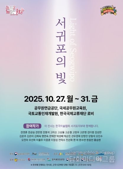 ‘예술이다 서귀포, 혁신이 주는 달콤함’의 피날레를 함께하는 한국미술협회 서귀포지부와 함께하는 특별기획전시 '로비가 미술관: 서귀포의 빛'이 27일(월)부터 31일(금)까지 추진된다. 전시는 공무원연금공단, 국세공무원교육원, 국토교통인재개발원, 한국국제교류재단 로비에서 동시에 펼쳐지며, ‘서귀포의 빛’이라는 주제로 아름답게 빛나는 서귀포의 모습과 색감을 작가들의 다양한 감성으로 표현된 작품을 선보인다. 매일 스쳐지나가는 로비의 풍경에서 영감이 가득한 일터로의 변화를 느낄 수 있도록 기획했다.