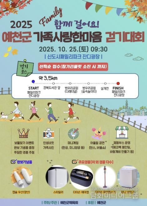 시민행정신문 기자 | 예천군에서는 오는 25일 오전 9시 30분부터 호명읍 신도시패밀리파크 잔디광장에서 ‘2025 예천군 가족사랑한마음 걷기대회’ 가 열린다.