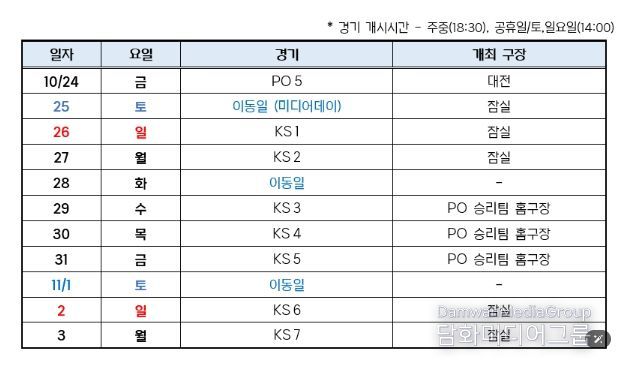 이에 따라 한국시리즈 미디어데이는 10월 25일(토), 한국시리즈는 1차전은 10월 26일(일)에 개최될 예정이다.