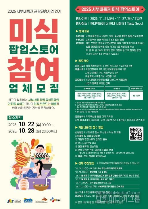시민행정신문 강갑수 기자 | 세종시문화관광재단이 ‘2025 서부내륙권 관광진흥사업’의 일환으로, 수도권 소비자에게 세종의 우수한 미식 자원을 소개할 ‘서부내륙권 미식 팝업스토어’ 참여업체를 공개 모집한다. 공모를 통해 선정된 업체는 국내 트렌드를 선도하는 현대백화점 ‘더현대 서울’(지하 1층 Tasty Seoul관)에서 소비자들을 직접 만날 예정이다.