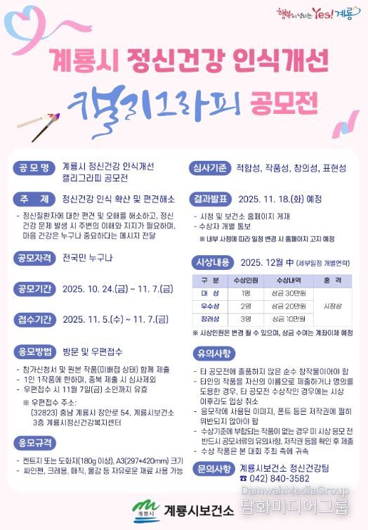 시민행정신문 기자 | 계룡시는 정신건강 홍보주간(10. 10.∼24.)을 맞아 시민이 직접 참여하는 ‘계룡시 정신건강 인식개선 캘리그라피 공모전’을 개최한다.