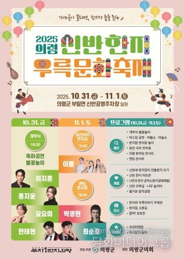 11월 1일 오후 5시부터는 지역 예술인들이 참여하는 ‘의령 한마당 콘서트’와 인기가수 박광현·최순호가 출연하는 ‘엔딩콘서트’가 이어지며 축제의 열기를 더한다.