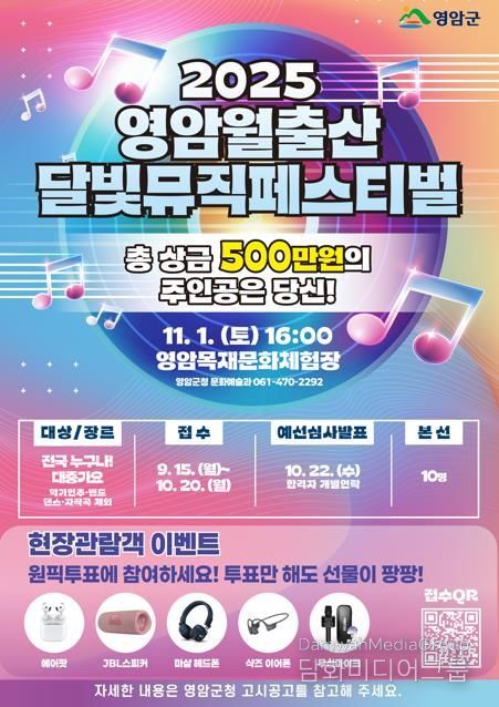 영암군(군수 우승희)이 11/1일 오후 4시 목재문화체험장에서 ‘2025 영암 월출산 달빛 뮤직 페스티벌’을 개최한다.